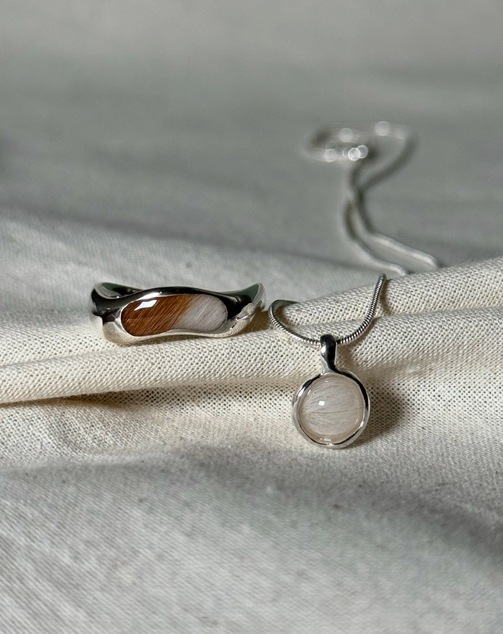 独特なテクスチャーと上品な光沢が魅力のサテン仕上げのペンダントに、ミニマルで滑らかな