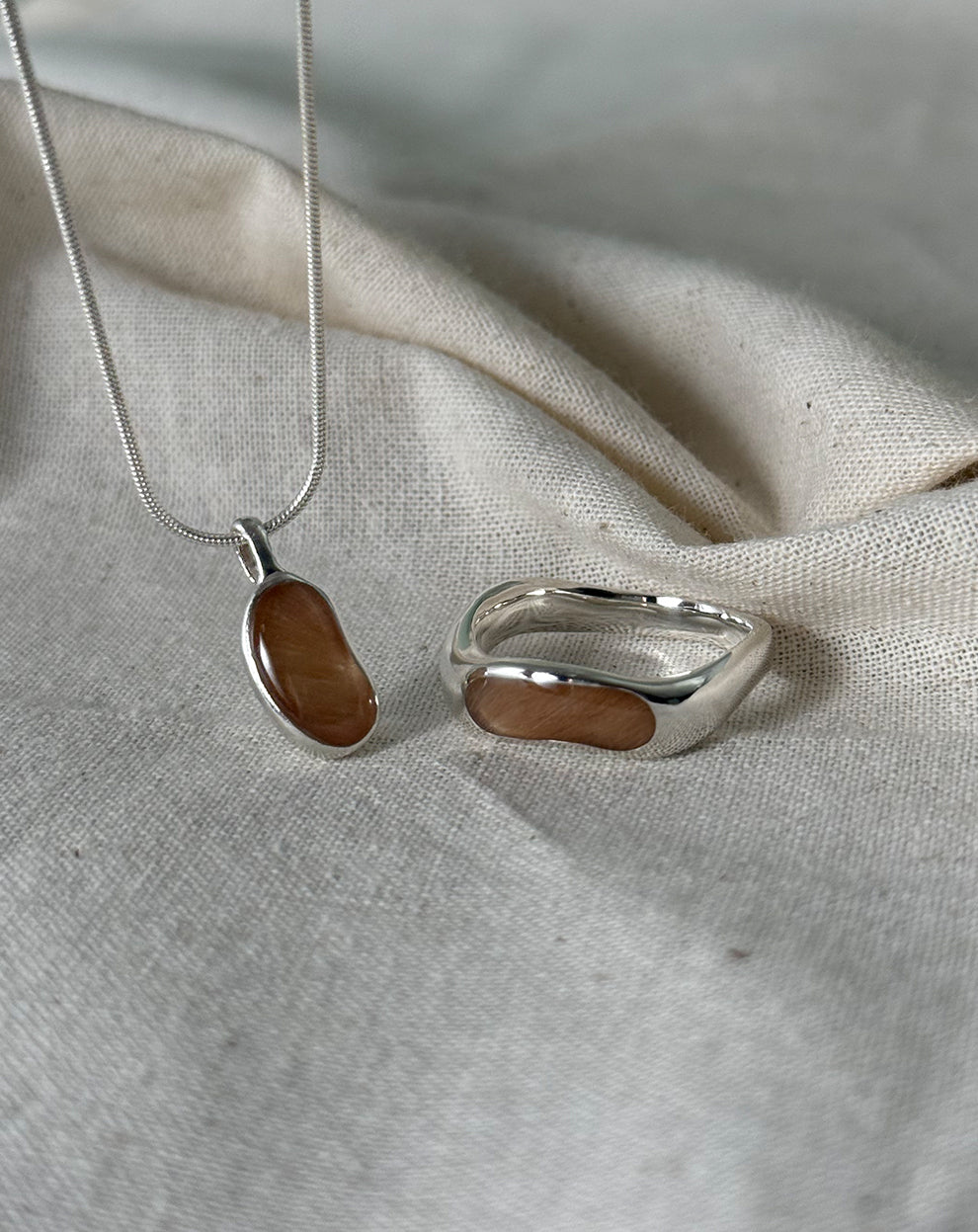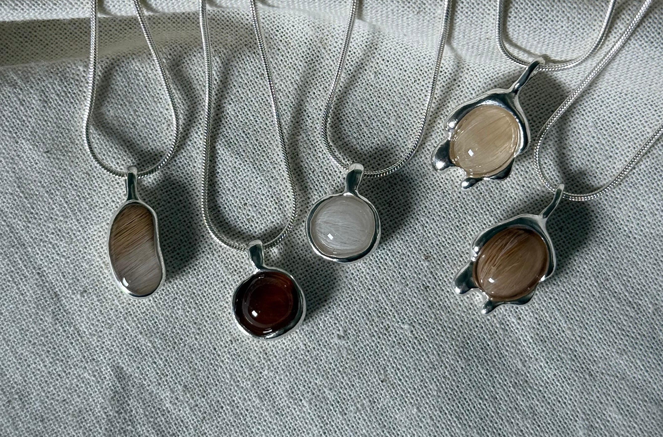 独特なテクスチャーと上品な光沢が魅力のサテン仕上げのペンダントに、ミニマルで滑らかな